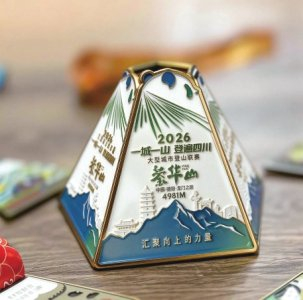 以“汇聚向上的力量”为主线,以极简几何线条勾勒出山峰轮廓,传递户外赛事环保健康的理念。最具巧思的是,奖牌采用可拼合的山脉形态设计——多人组队打卡不同山峰,可将各自奖牌拼合成完整的“团队攀登版图”,让集体记忆可视化;单人完成多峰挑战,亦可自由排列组合,打造专属“登山成就墙”。从单块徽章到拼合后的山脉全景,激发更多人加入“登遍四川”的行列。